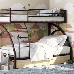 Конструкция кровати предусматривает спальные места разных размеров: верхнее 90*190 см и нижнее 120*190 см. Верхний ярус защищен прочными бортиками. Лестницу можно установить с любой стороны. Кровать оборудована большим выкатным ящиком для белья или дргих вещей.