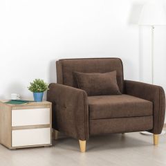 Кресло обтянуто мебельной тканью или искусственной кожей, каркас-дерево, боковины выполнены в виде криволинейных деталей, образующих ножки-опоры, материал боковины фанера. На боковинах имеются мягкие подлокотники. Модель с выдвижной подножкой.