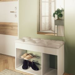«Вита» — обувница из бежевой экокожи с каретной стяжкой. Удобный мягкий элемент и открытые ячейки делают её идеальной для небольшой прихожей. Основные ниши предназначены для кроссовок, туфель и тапочек, боковая же ниша — для более высокой обуви. А под откидной верхней крышкой — ниша для перчаток, зонтика, крема для обуви или других полезных мелочей, необходимых при выходе из квартиры.