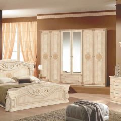 Количество резных и рельефных элементов в спальне «Рома» невелико. Но оттого оно еще более ценно. Взгляните на изголовье и переднюю спинку кровати – там присутствуют совершенно одинаковые резные фрагменты, которым созвучное нечто подобное над зеркалом, хотя и пропорционально уменьшенное. Редкий случай, когда аскетичность и минимализм не противоречат духу средневековой роскоши. Шкафы (они предусмотрены двух версий – с 6 либо с 4 дверцами) строги, под зеркалами два ящика.